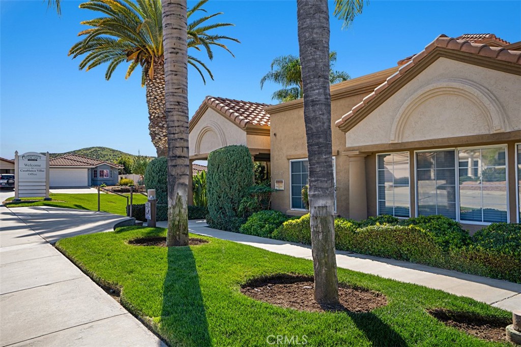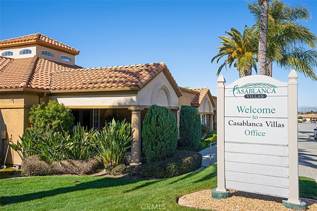 Great location in the Casablanca Villas 55+ community, this single level home features new interior paint throughout and new carpet. Attractive tile flooring in dining room, kitchen, and bedroom hall. Kitchen boast gas stove, quaint eating nook area with window view to the front exterior and an abundance of natural lighting. Dining and living rooms boast an elegant French door that leads to the landscaped walkway planted with rose bushes. High ceiling in the living room provides a sense of open and large space. Each large bedroom features sliding doors to the quaint backyard; the primary bedroom features walk in closet, master bath with walk in shower, new carpet and vaulted ceiling. Second bedroom amenities include large closet with mirror doors, new carpet and paint. Backyard features covered patio with new concrete slab, vinyl and cylinder block fencing, planter areas, and beautiful queen palm trees. Other amenities include newer Central AC, interior garage access, washer and dryer hook up in the garage with wash basin sink, roll up garage door with garage door opener. Low monthly HOA dues include club house, sparkling pool, spa, and tennis courts.